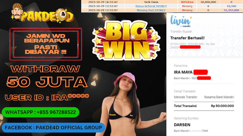 Selamat Kepada Member Setia PAKDE4D dengan USER ID : IRA*** di PERMAINAN TOGEL PASARAN SYDNEY sebesar Rp. 50.000.000,- LUNAS langsung mendarat ke rekening tanpa bertele – tele. Terimakasih telah mempercayakan PAKDE4D sebagai Situs Bandar Terpercaya dan Terjamin Aman! Tunggu apalagi? Daftar sekarang juga bersama PAKDE4D dan dapatkan berbagai promo menarik setiap harinya.