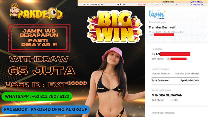 Selamat Kepada Member Setia PAKDE4D dengan USER ID : FXT******* di PERMAINAN SLOT sebesar Rp. 65.060.000,- LUNAS langsung mendarat ke rekening tanpa bertele – tele. Terimakasih telah mempercayakan PAKDE4D sebagai Situs Bandar Terpercaya dan Terjamin Aman! Tunggu apalagi? Daftar sekarang juga bersama PAKDE4D dan dapatkan berbagai promo menarik setiap harinya.